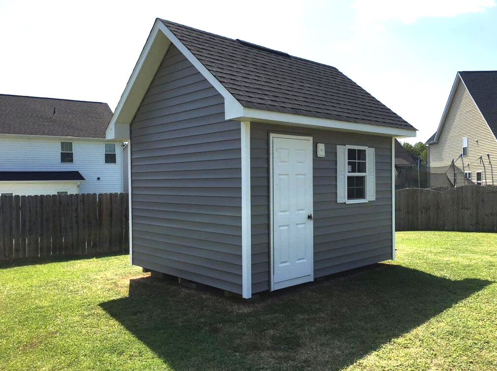 This shed can be built with HardiePlank (Cedarmill) siding, vinyl siding (CertainTeed Mainstreet D5 straight), or Smart Side panel siding. We use Tyvek (generic) house wrap before applying Hardiplank or vinyl siding. All vinyl-sided sheds have their eaves wrapped in trim coil standard. Available in sizes 8′ x 8′ up to 16′ x 24′.